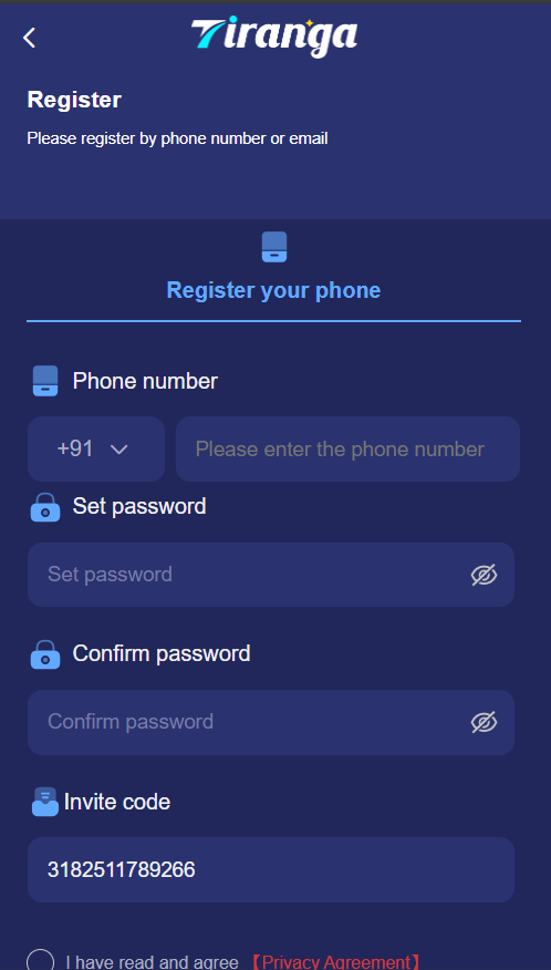 Tiranga Games app opening will ask new users to register, or log in for already registered users after installation. New users can register by entering personal info while existing users can sign in with their passwords.